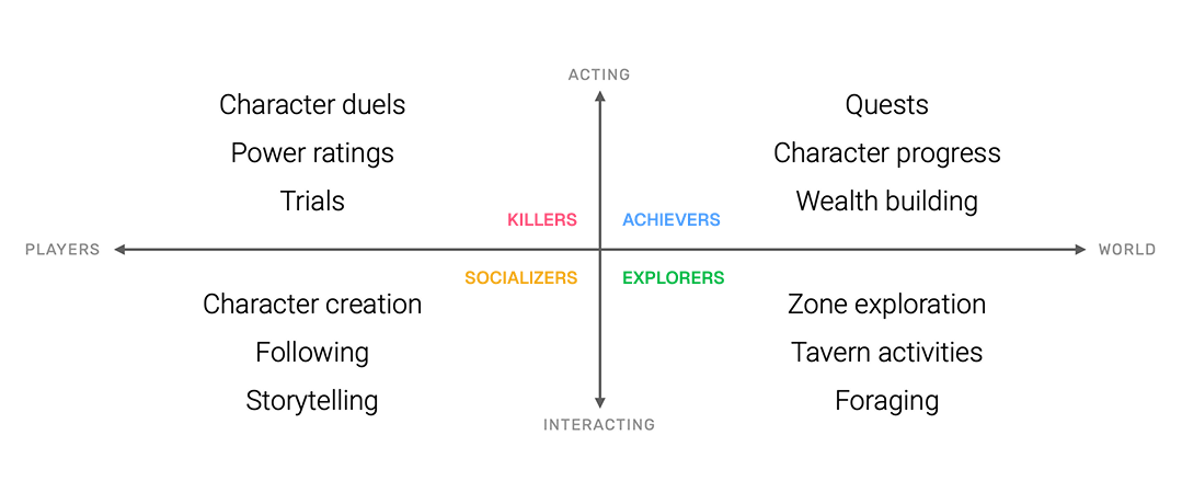 This is a graphic applying all the activities available in Larkur to the Bartle taxonomy of player types. This ensured interesting content for each kind of person.